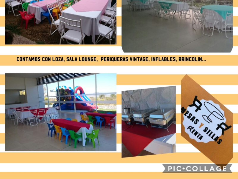 Renta de mesas y sillas. Contamos con loza, sala lounge, periqueras vintage, inflables, brincolín y más. Nos encontramos en Zibatá, no cobramos flete ni pedimos un mínimo de renta.